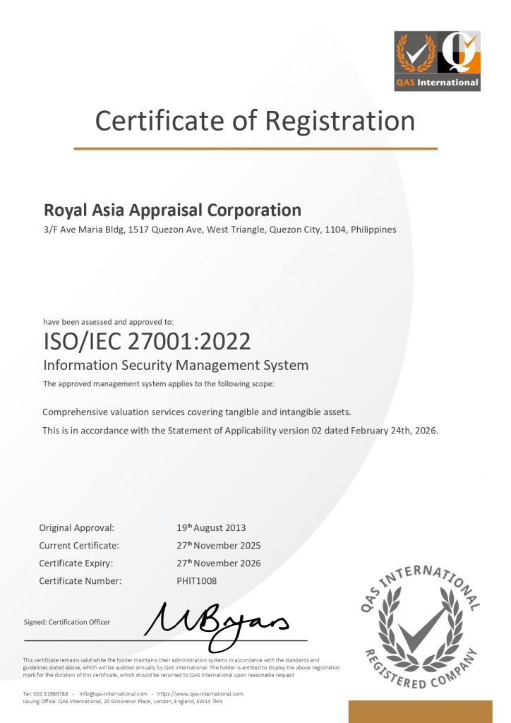 ROYAL ASIA APPRAISAL CORPORATION recognizes that the disciplines of quality, health & safety and environmental management are an integral part of its management function. The organization views these as a primary responsibility and to be the key to good business in adopting appropriate quality standards. The organization quality policy calls for continuous improvement in its quality management activities and business will be conducted according to the following principles: